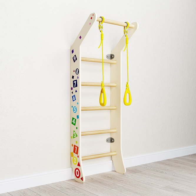 Детская стенка с креплениями к стене для самых маленьких. Спортивно-игровой комплекс «Луна 2» разрешено использовать в детских дошкольных учреждениях. В комплекте: кольца гимнастические.