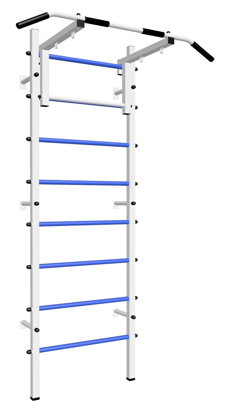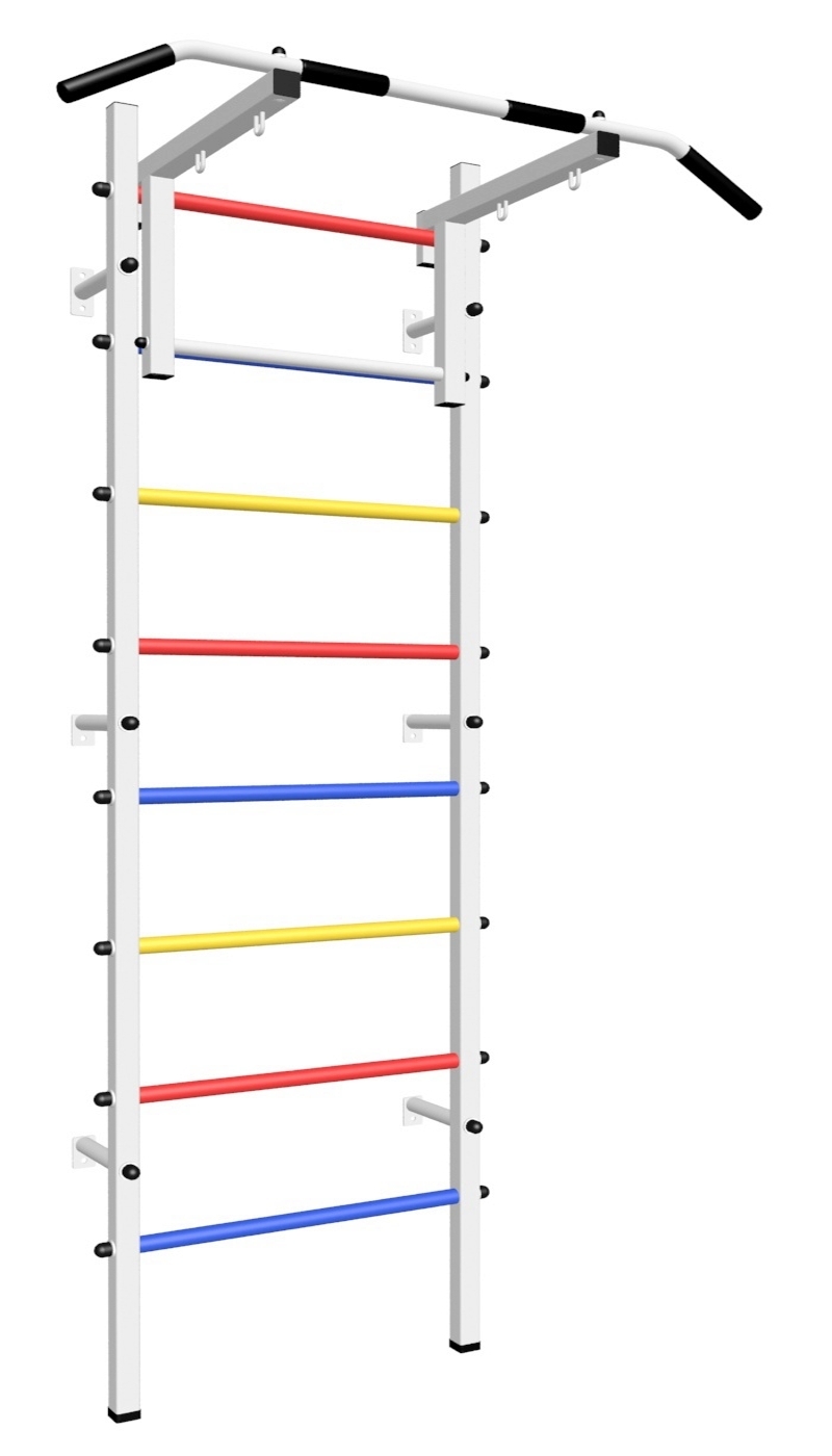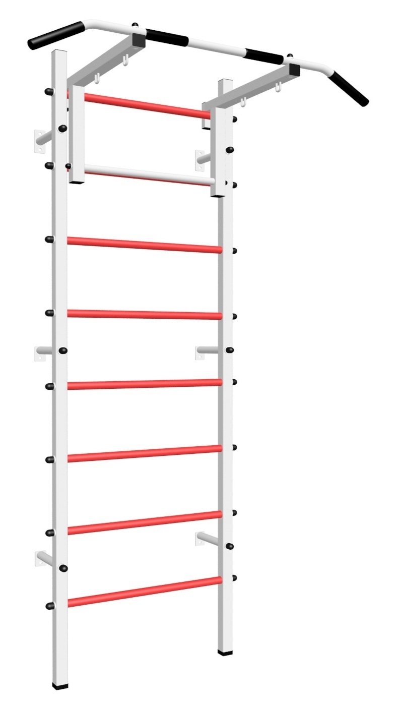 Стойки шведской стенки Sv Sport усиленные изготовлены из профильной трубы 60 х 40 х 2 мм. Ступени изготовлены из круглой, стальной трубы, покрытой резиной (не скользят, не натирают мозоли, не прокручиваются, не имеют запаха, приятны на ощупь). Устанавливается к стене при помощи 6 кронштейнов. На перекладину, в местах хватов, одеты резиновые ручки.