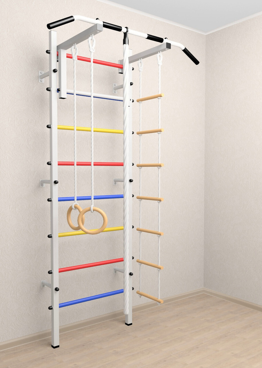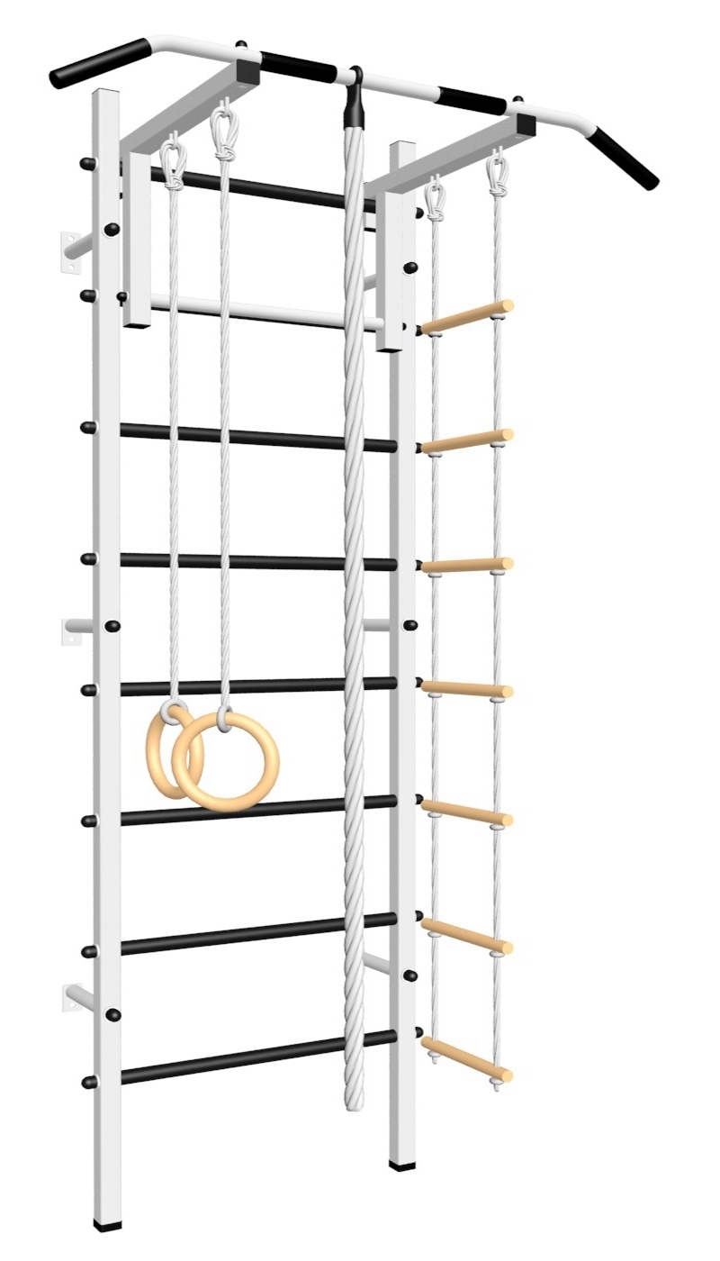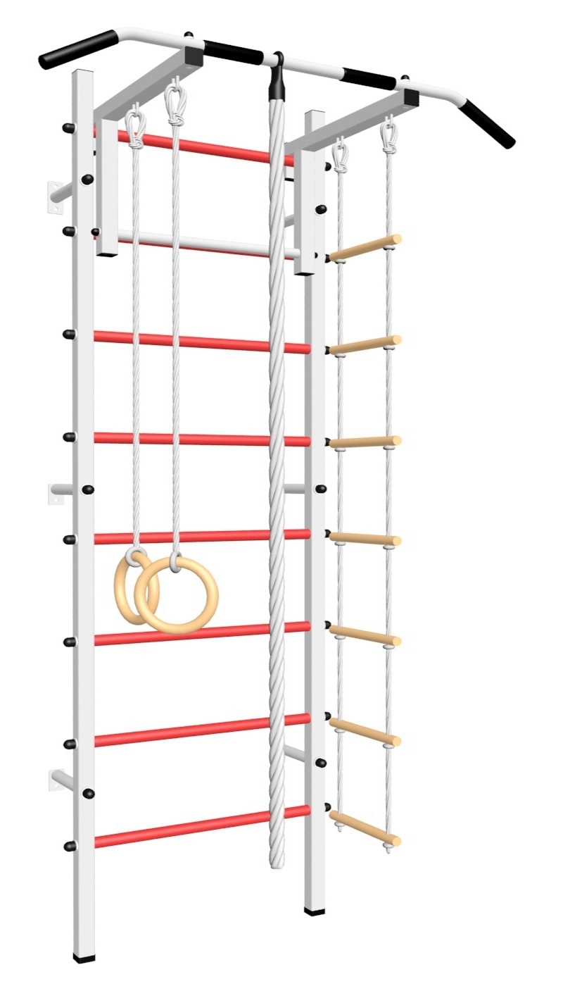 Стойки шведской стенки Sv Sport усиленные изготовлены из профильной трубы 60 х 40 х 2 мм. Ступени изготовлены из круглой, стальной трубы, покрытой резиной (не скользят, не натирают мозоли, не прокручиваются, не имеют запаха, приятны на ощупь). Устанавливается к стене при помощи 6 кронштейнов. На перекладину, в местах хватов, одеты резиновые ручки.