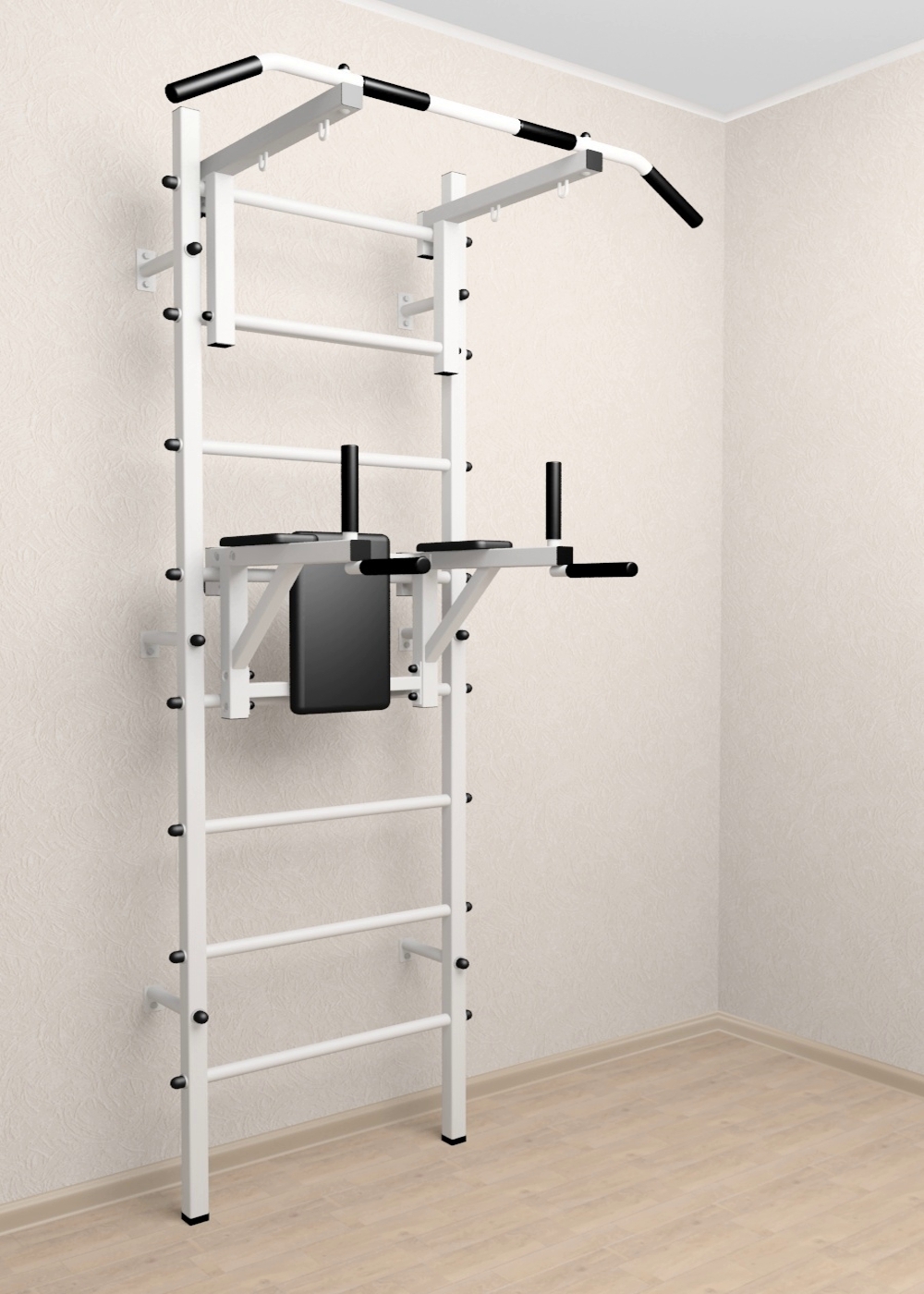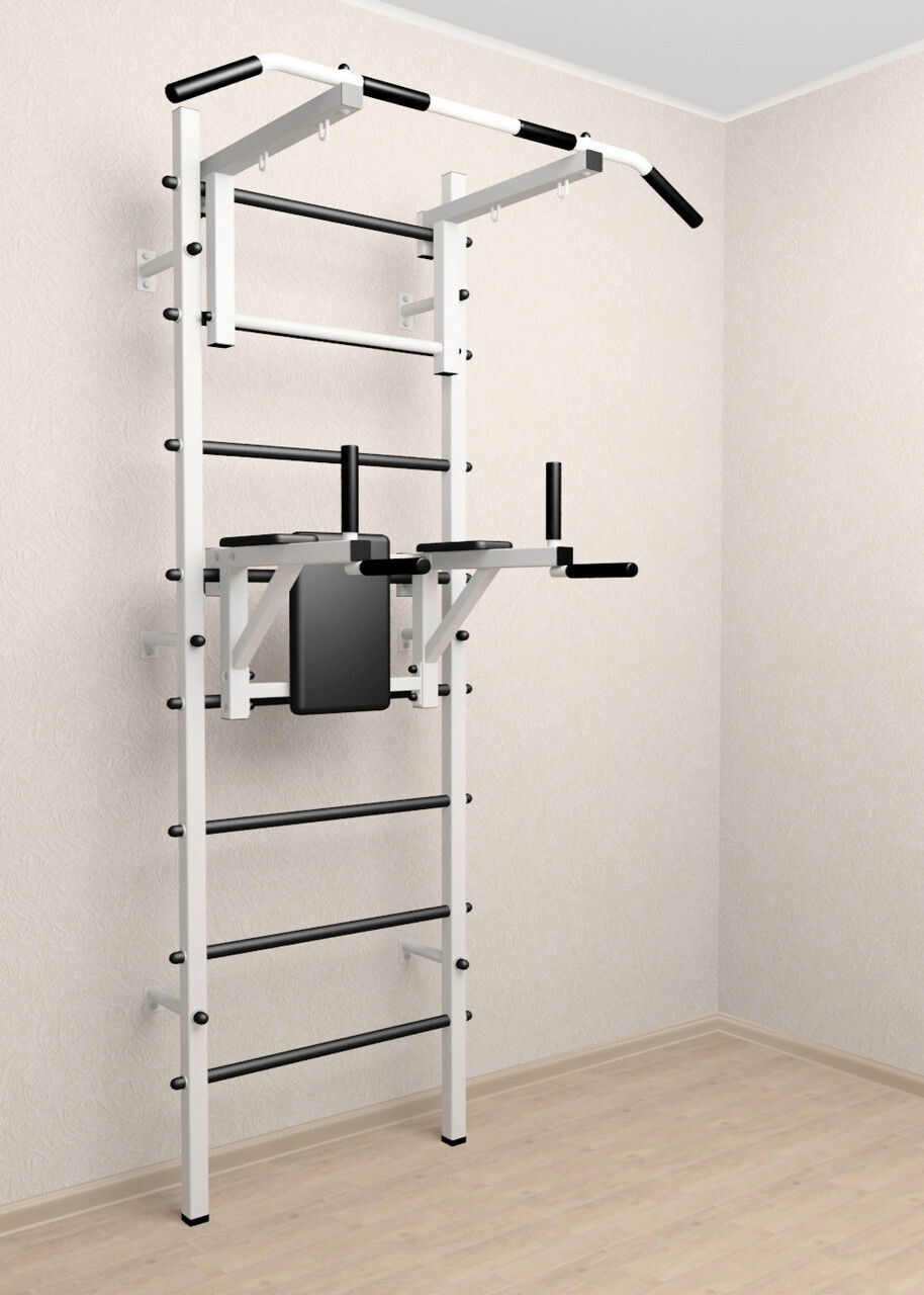 Стойки шведской стенки Sv Sport усиленные изготовлены из профильной трубы 60 х 40 х 2 мм. Ступени изготовлены из круглой, стальной трубы, покрытой резиной (не скользят, не натирают мозоли, не прокручиваются, не имеют запаха, приятны на ощупь). Устанавливается к стене при помощи 6 кронштейнов. На перекладину, в местах хватов, одеты резиновые ручки.