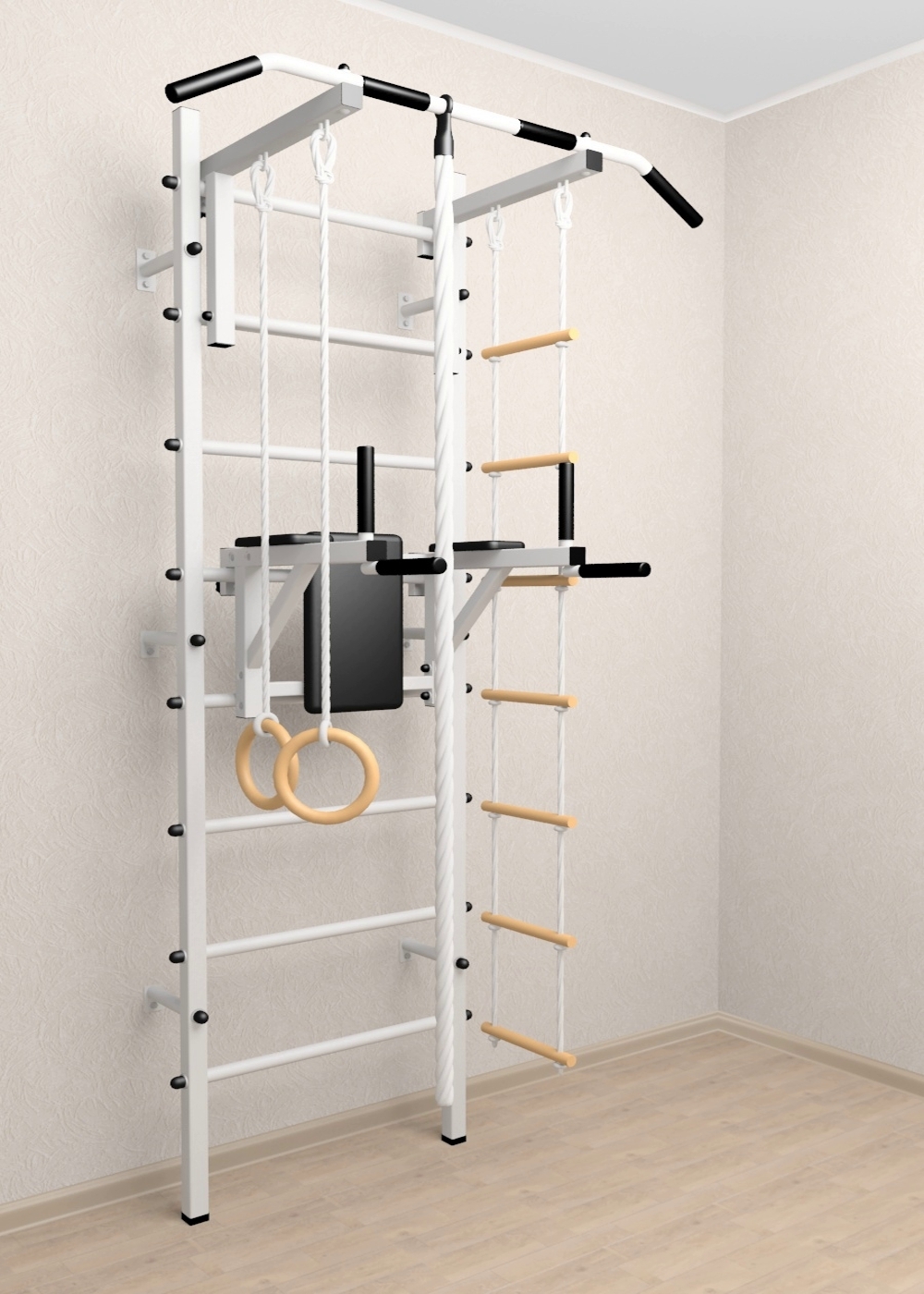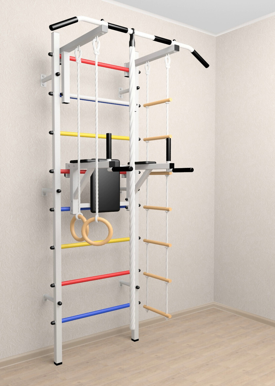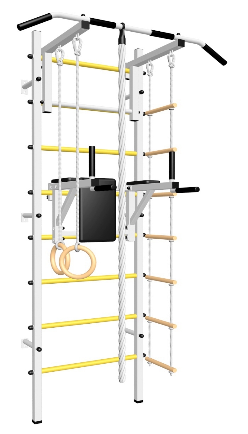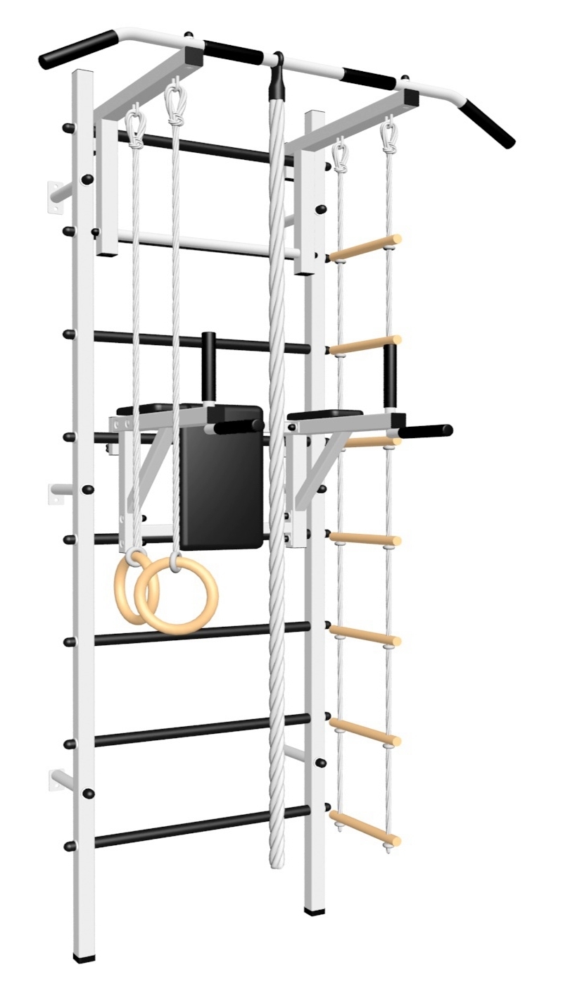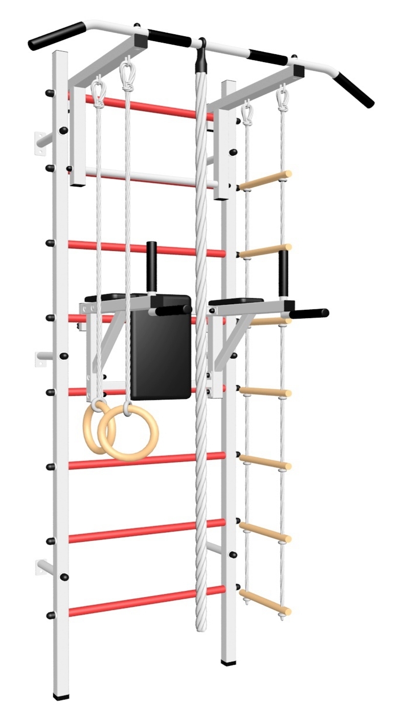 Стойки шведской стенки Sv Sport усиленные изготовлены из профильной трубы 60 х 40 х 2 мм. Ступени изготовлены из круглой, стальной трубы, покрытой резиной (не скользят, не натирают мозоли, не прокручиваются, не имеют запаха, приятны на ощупь). Устанавливается к стене при помощи 6 кронштейнов. На перекладину, в местах хватов, одеты резиновые ручки.