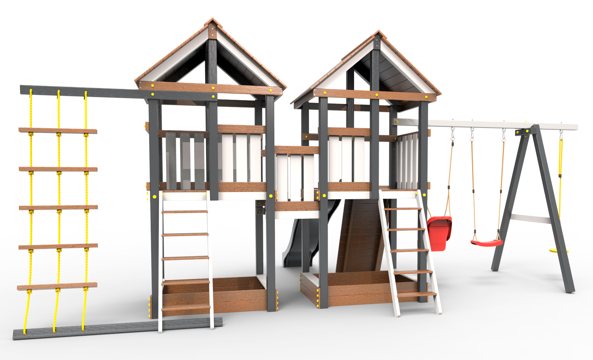Все столбы и качельная балка площадки выполнена из высокопрочного клеёного бруса камерной сушки сечением 90х90мм.