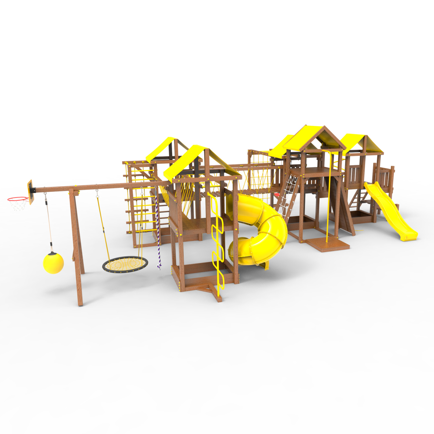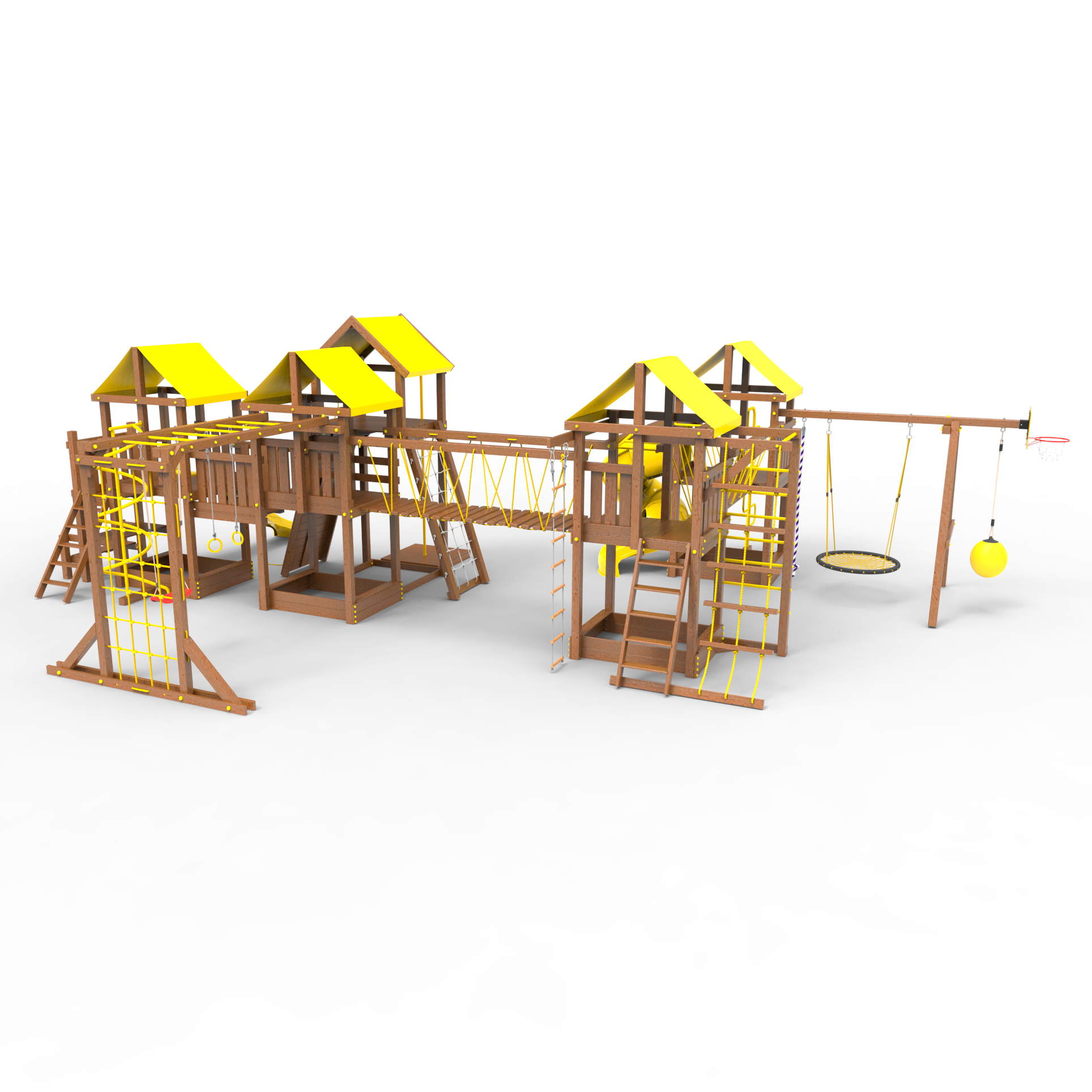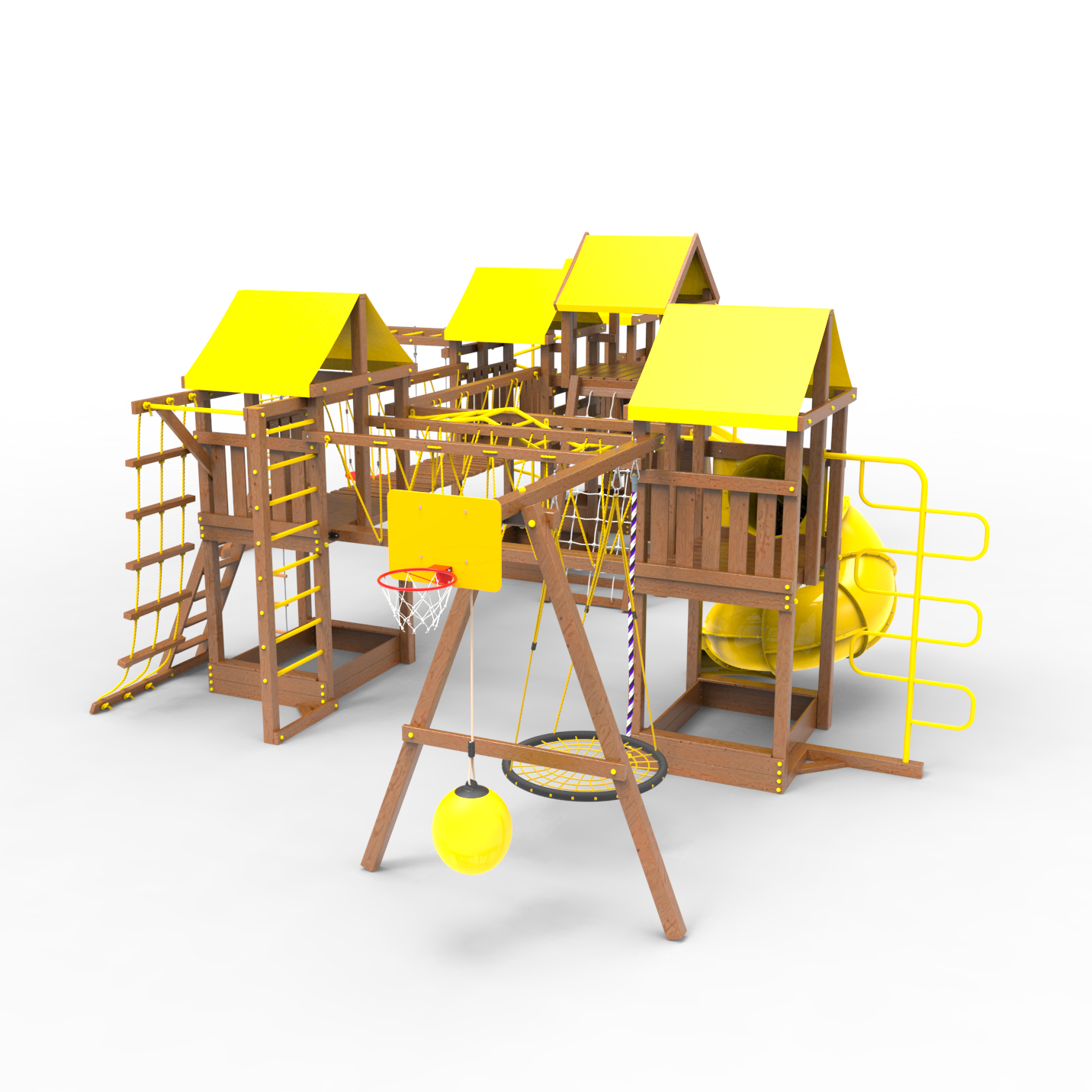 Комплектация Высокий домик|Два домика|Песочница|Лестница|Шторм-трап|Скалодром|Шведская стенка|Рукоход|Турник|Руфер|Балкон|Столик с лавочками|Баскетбольная корзина|Мостик|Подвесной мост|Горка|Винтовая труба|Спираль|Волна|Пожарный шест|Сеть для лазания|Качели|ЗигЗаг|Переправа