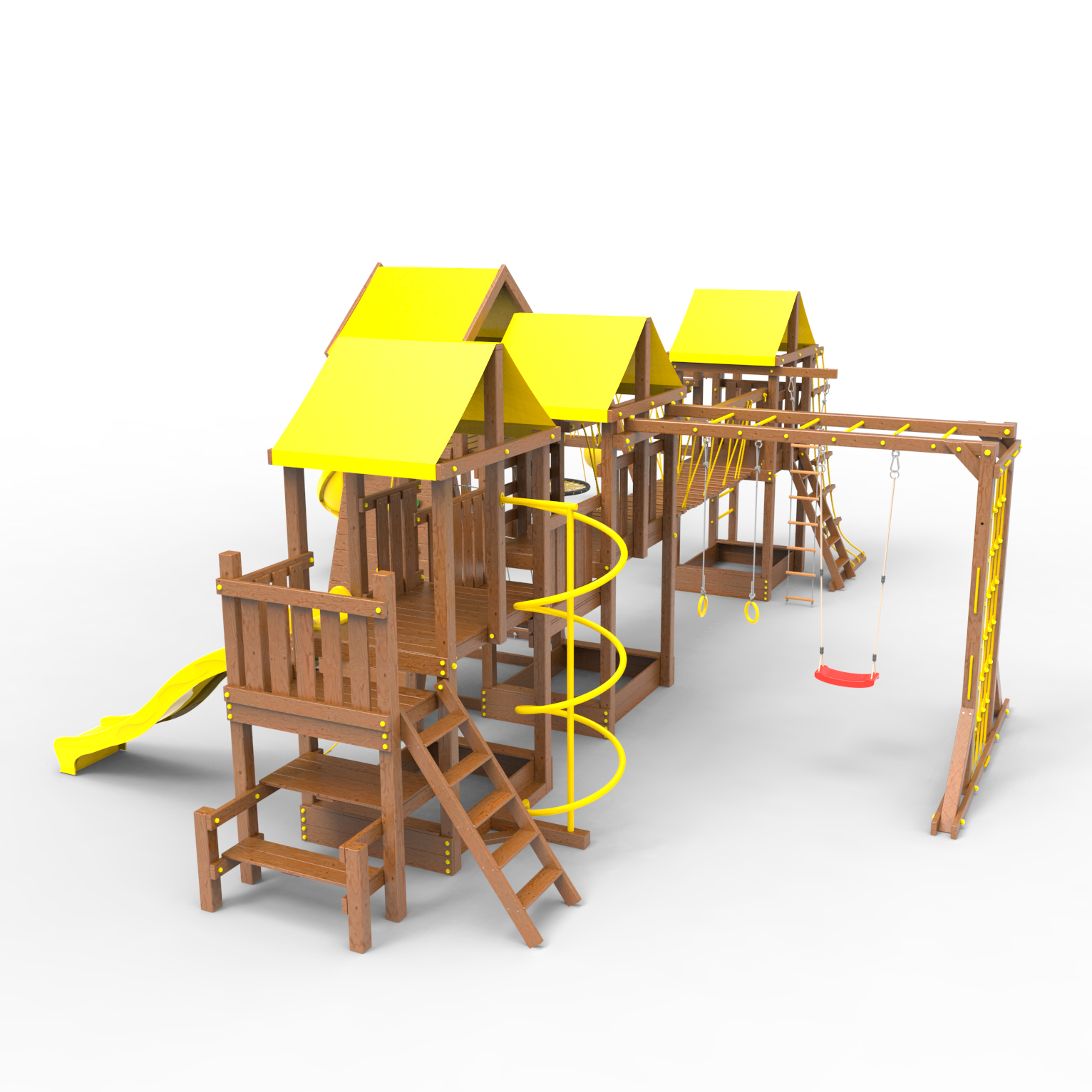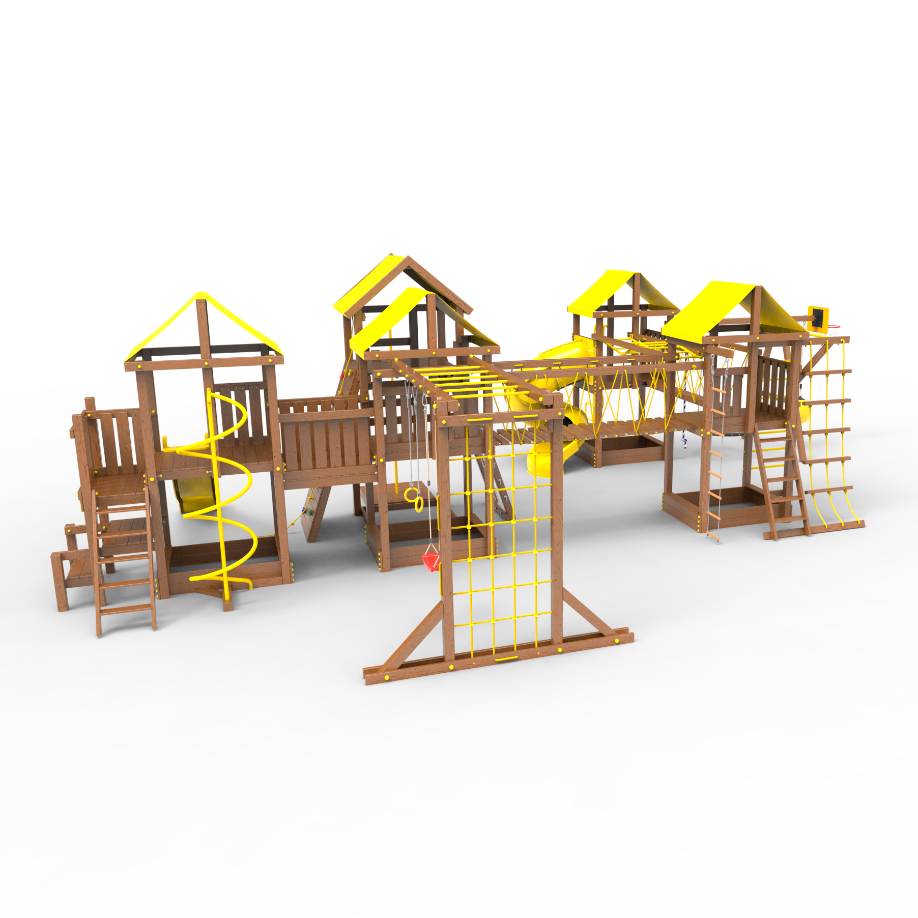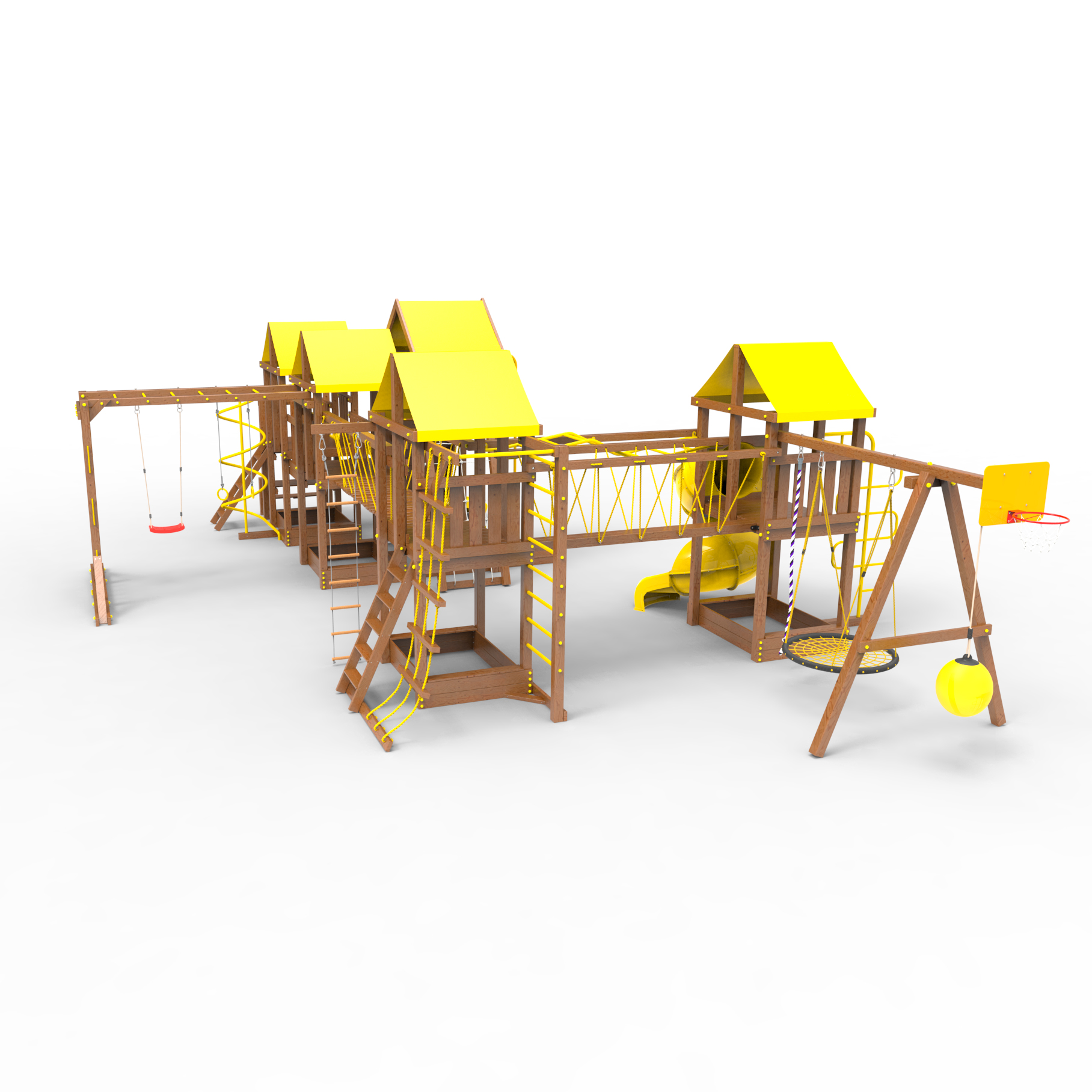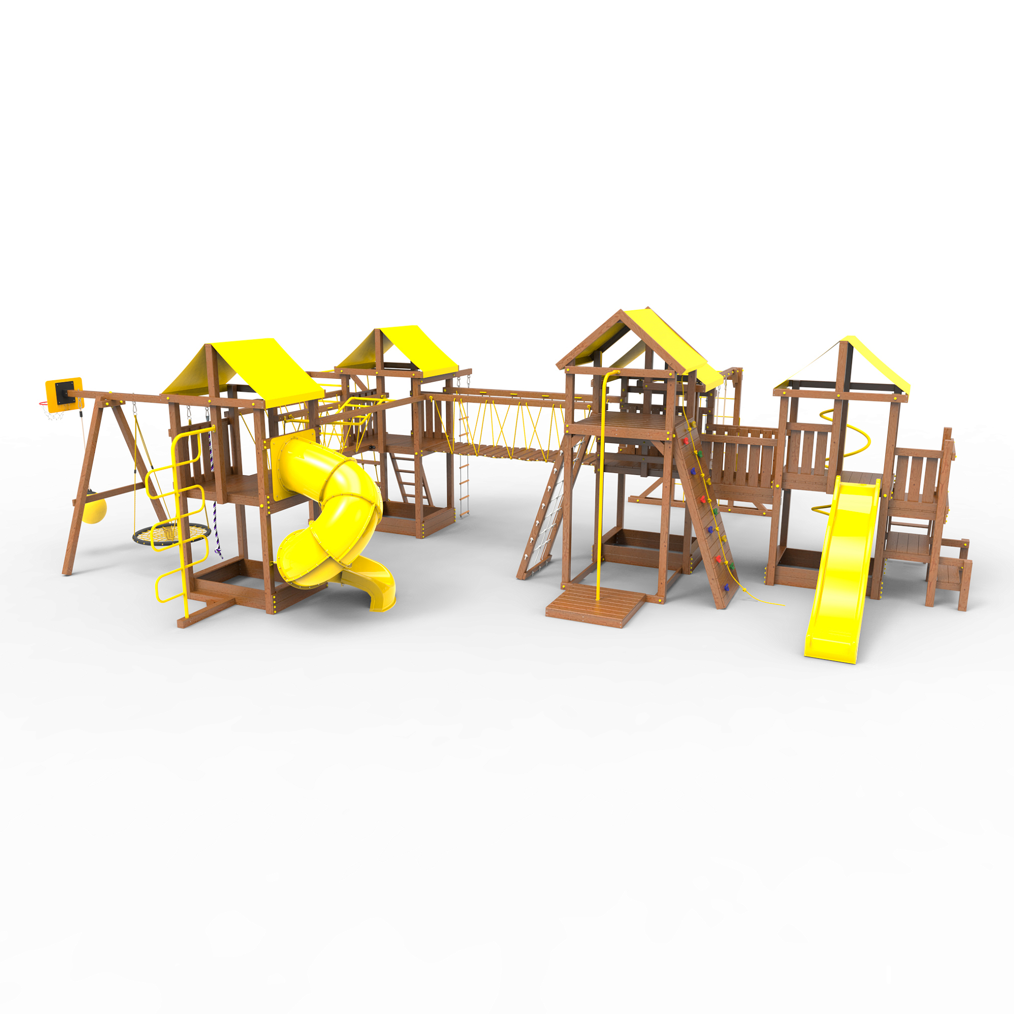 Комплектация Высокий домик|Два домика|Песочница|Лестница|Шторм-трап|Скалодром|Шведская стенка|Рукоход|Турник|Руфер|Балкон|Столик с лавочками|Баскетбольная корзина|Мостик|Подвесной мост|Горка|Винтовая труба|Спираль|Волна|Пожарный шест|Сеть для лазания|Качели|ЗигЗаг|Переправа