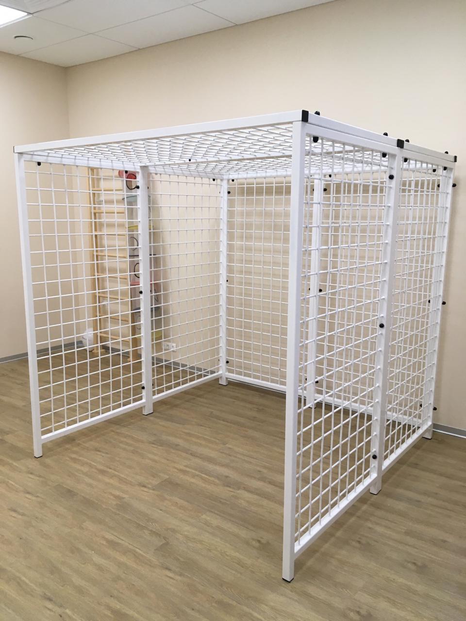Реабилитационная система изготовлена из профильной трубы 40 х 40 х 2 мм и стальной сетки. Клетка состоит из 8 секций, скрепленных между собой при помощи болтовых соединений. Металлические детали окрашены, импортной порошковой краской, которая устойчива к истиранию и температурным перепадам. Все торцы, болты, гайки заглушены пластиковыми заглушками отличного качества. Использующиеся болты и гайки оцинкованы и соответствуют требованиям ГОСТ. Устанавливается реабилитационная система на ровную поверхность внутри помещении. Допустимый вес на оборудование 120 кг.